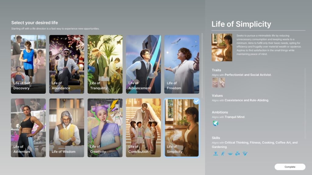 The Desired Life system works alongside ambitions as a broader character archetype. Players can choose from 16 different Desired Lives when creating a Zoi, or select "Life of Self-Creation" for complete freedom with no preset traits or ambitions. Each Desired Life pre-selects a combination of traits, values, preferences, aligned skills, and a default ambition that match the chosen lifestyle.