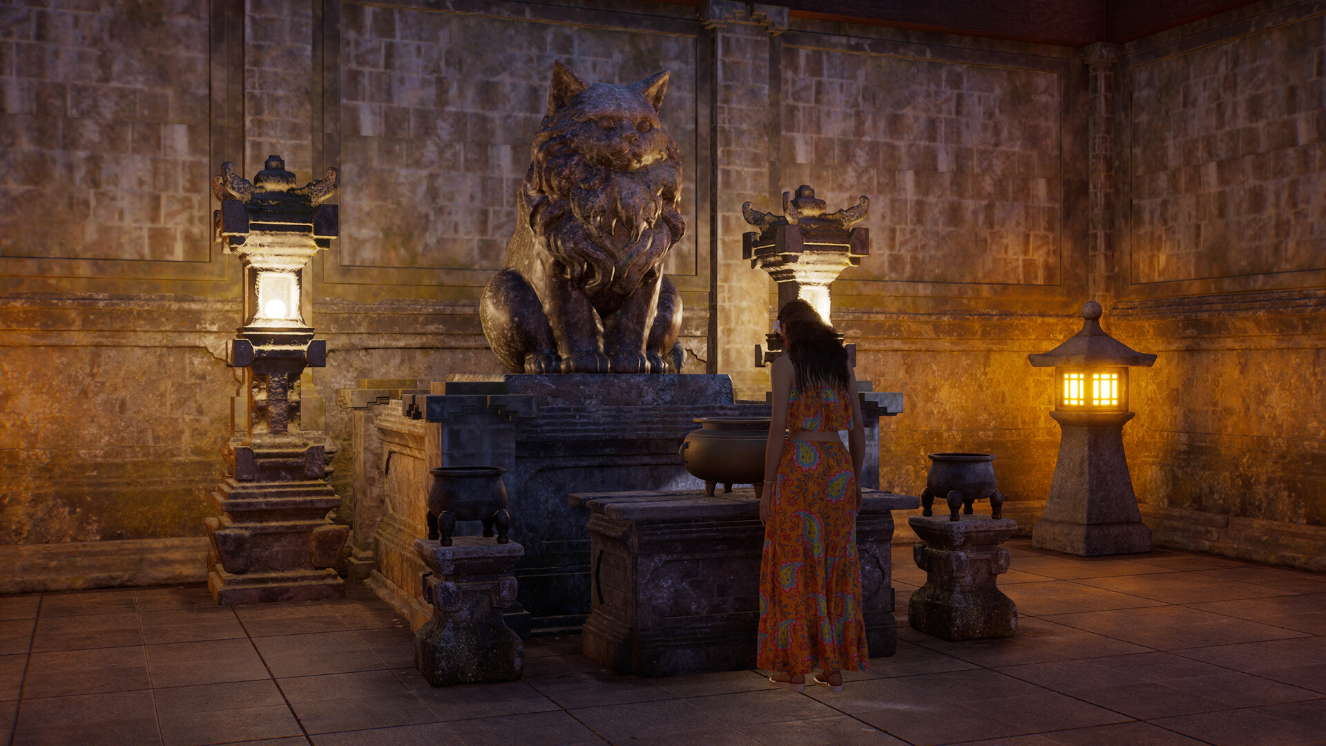 At the Guardian Statue in the main temple area, Zois can interact with the Incense Burner to burn incense and pray. This is a short meditative action that provides a mood boost and reduces stress. The Guardian Statue is flanked by Guardian Cat sculptures, and the atmosphere is serene.